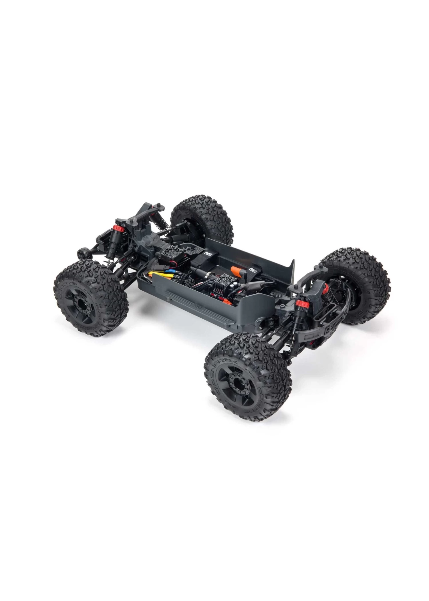 It has the ingenious modular design perfected by ARRMA® engineers for easy component access and maintenance. The power module, with improved dirt management, consists of the motor with ARRMA® heatsink and cooling fan, plus motor plate, slipper clutch assembly and gear cover. The power module can be detached from the chassis as a complete unit by removing just one screw. With the power module removed, the slipper clutch can be reached easily for adjustments by taking out three screws that attach the gear cover. The gear ratio can be finely tuned as the power module now uses a sliding motor mesh design.
