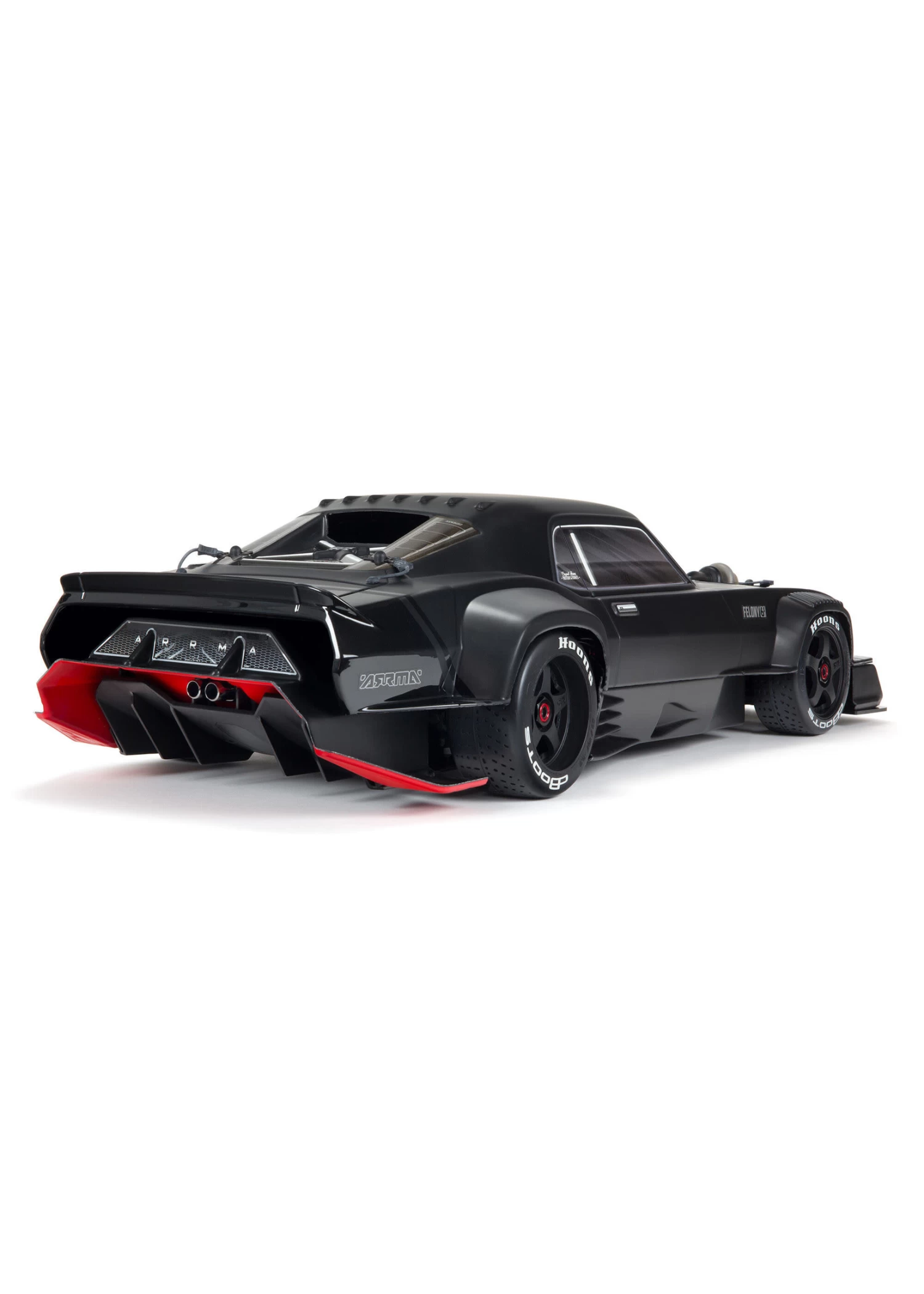 The multi-part, undercut muscle car body design with an aerodynamically adjustable wing delivers standout street bashing style. It can also be customized with the included accessory kit and decals to provide scale muscle car looks the way YOU want them. The FELONY™ 6X BLX Street Bash RTR’s eye-catching appearance extends to the realistic 5-spoke wheels mounted with dBoots® Hoons™ all-road tires. For authentic muscle car handling, ARRMA® engineers have included regular front and larger rear tires, with the front and rear gearbox ratios matched to the tire sizes.