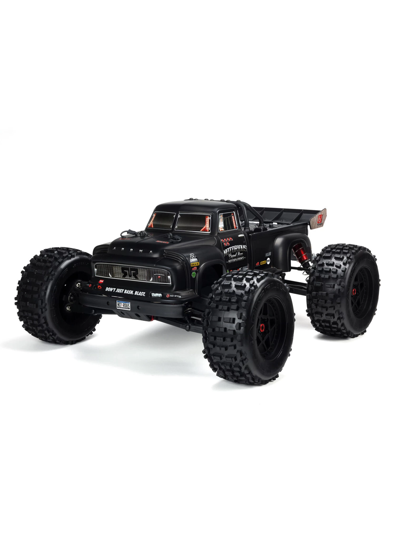 For the power to perform that kind of stunt action, ARRMA® now equips the NOTORIOUSâ„¢ 6S BLX 4WD with a potent, 6S-capable brushless system featuring the Spektrumâ„¢ Firmaâ„¢ 150A Smart ESC and Firmaâ„¢ 2050Kv brushless motor. The combination lets you cut loose with incredible torque, acceleration and speed, while the heavy-duty aluminum and steel chassis and transmission components take it all in its stride. For improved steering, ARRMA® also includes a new, steel gear Spektrumâ„¢ S652 Digital Servo — which is 32% stronger and 5% faster than the previous version’s ADS-15M servo. Thanks to waterproof electronics, bashing is a “go” even through mud and snow. Just add your favorite 4S or 6S LiPo battery.