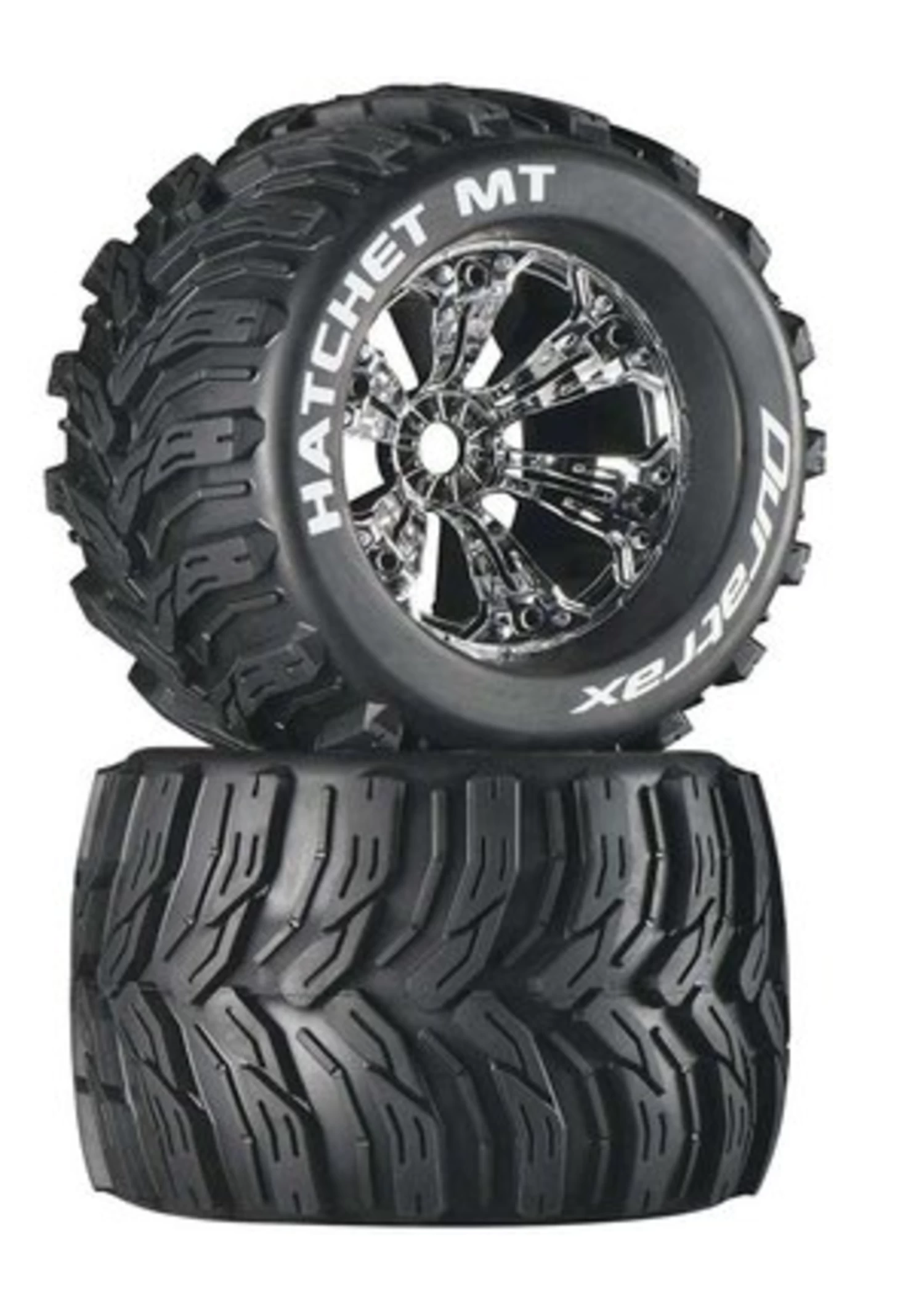 Includes:Â Two DuraTrax Hatchet 3.8 1/2 Offset Mounted Monster Truck Tires with Chrome Wheels and Foam inserts, (2)