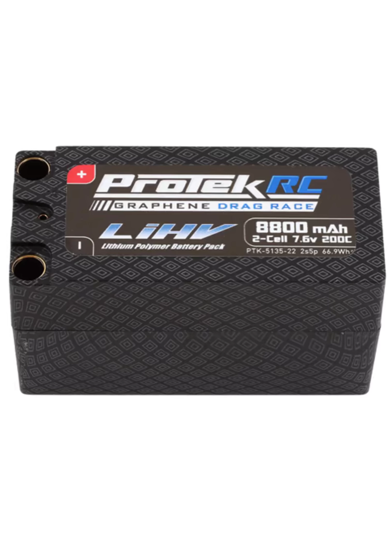 ProTek RC was tasked with developing a LiPo battery capable of delivering extremely high power with blistering fast ET’s. Needless to say, this pack delivers. Using a 2s5p cell configuration with a 200C burst rate, the ProTek Drag Race LiPo can hold up to the extreme voltage drops found in most high power, low turn drag setups. Get the ProTek RC 2S Si-Graphene Drag Race LiPo and run a battery that was made to win!