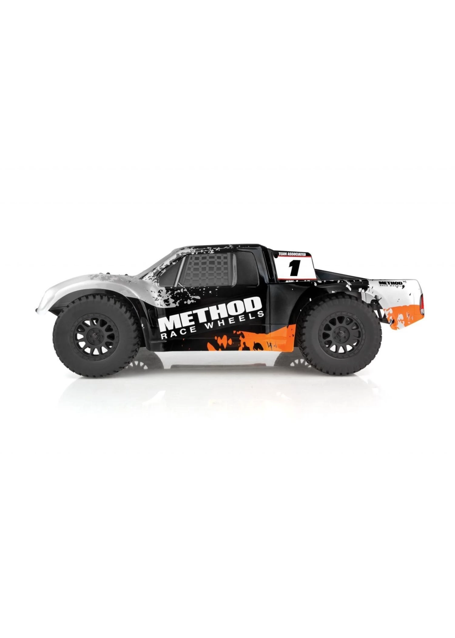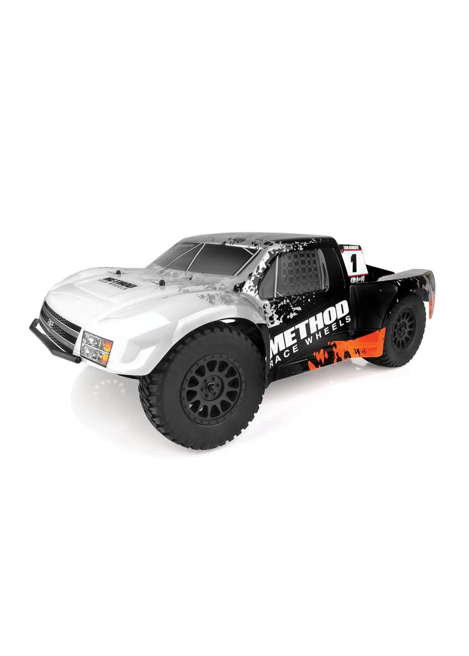 Team Associated’s Pro2 SC10 Method Race Wheels is a Ready-To-Run RC electric truck based on the 10-time R.O.A.R. winning Short Course National Champion. The Pro2 SC10 includes a water-resistant, high-power Reedy brushless speed control, Reedy 3300kV brushless motor, and a water-resistant, enclosed receiver box. The suspension includes adjustable blue anodized aluminum V2 12mm big bore coil-over shocks. The gearbox comes with a heavy-duty sealed-gear differential and the externally adjustable V2 slipper clutch. CVA driveshafts are included. The short course hex-drive wheels come standard on the Pro2 SC10 with realistic off-road wheels and tires to keep the truck gripping the ground.
