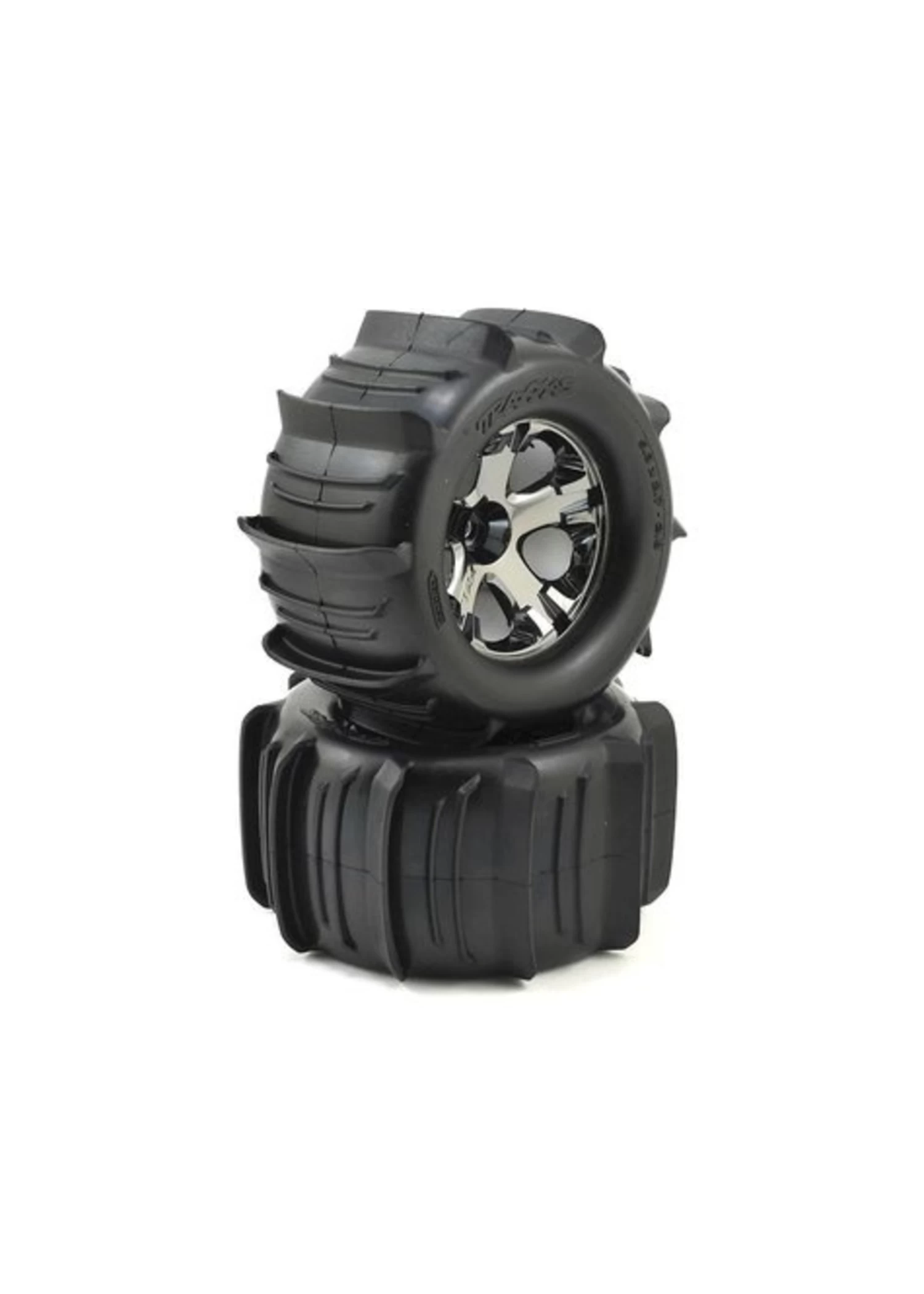 TRA4175 Traxxas Tires & Wheels, Assembled, Glued (2.8′) (All-Star Black Chrome Wheels, Paddle Tires, Foam Inserts) (nitro Rear/ 4WD Electric Front/rear) (2) (TSM Rated)