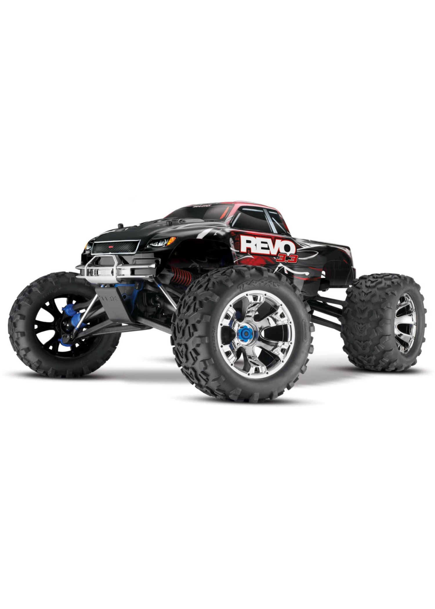 Revo’s specifications are more than just an impressive list of features. They are each specifically engineered and integrated into the model to provide capability, convenience, and most importantly, fun! Revo 3.3’s heavy-duty reversing transmission lets you easily back out of tight spots with the flick of a switch, while the OptiDrive®Electronic Transmission Control guarantees safe, smooth engagement. The Traxxas TQi 2.4GHz radio system features the exclusive Traxxas Link wireless Module with factory-installed telemetry sensors, a revolutionary concept that harnesses the power of your Android, Apple iPad, iPhone or iPod touch to create the ultimate radio system. Geodeâ„¢ chrome wheels with 17 mm hex hubs wear massive 6.3″ Maxx®-sized tires for big ground clearance and total traction in all conditions. Revo 3.3’s dual-digital servo steering system delivers 250 oz.-in of torque for powerful, responsive handling, plus they’re waterproof for ultimate reliability.