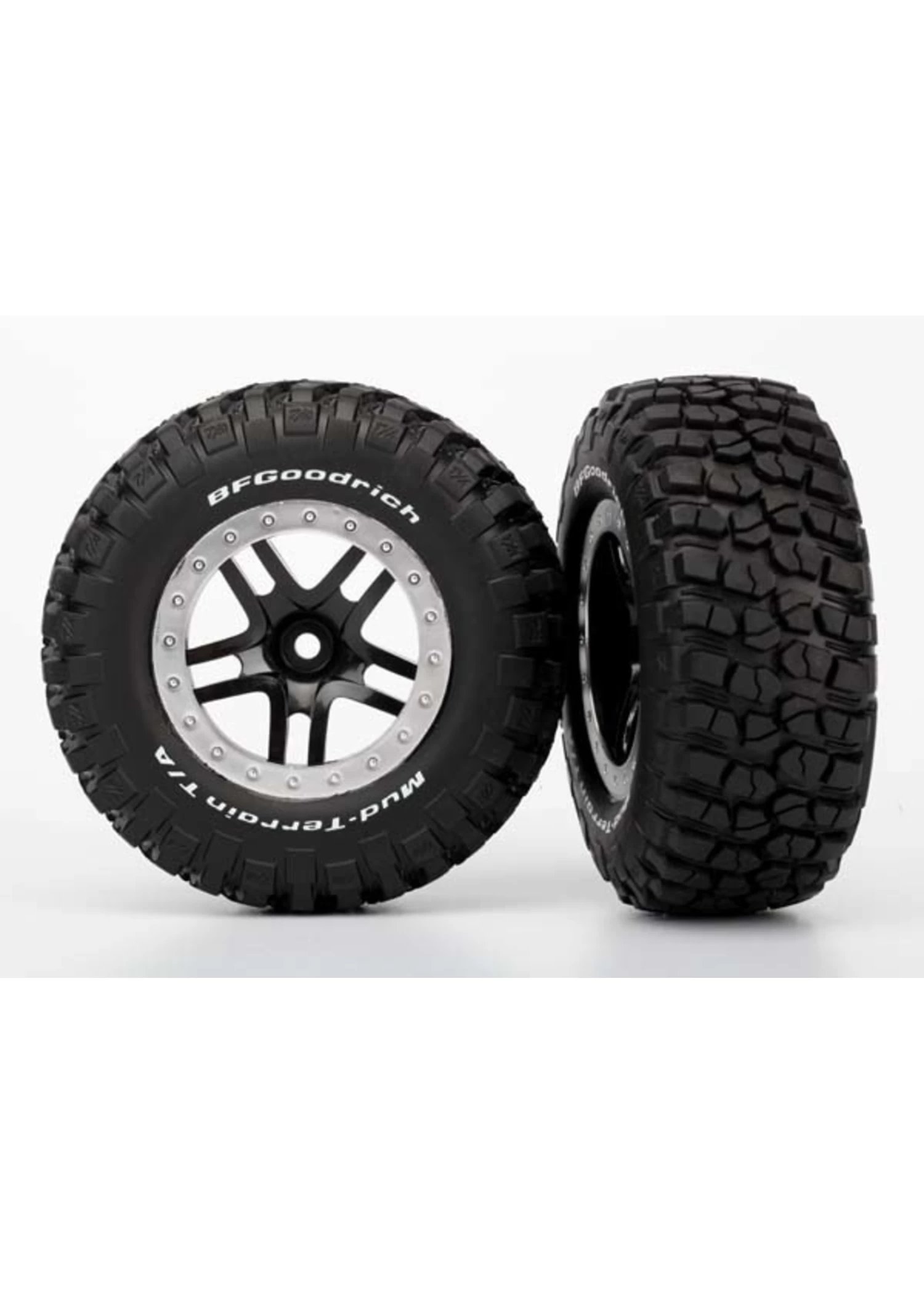 TRA5883 Traxxas Tires & Wheels, Assembled, Glued (SCT Split-Spoke, Black, Satin Chrome Beadlock Wheels, BFGoodrich Mud-Terrain™T/A KM2 Tire, Foam Inserts) (2) (4WD F/r, 2WD Rear)