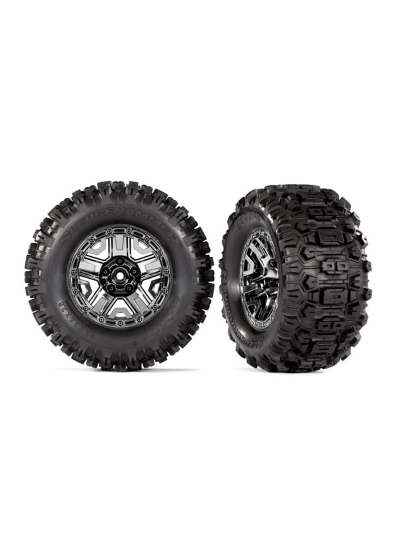 This is a set of Traxxas TSM Rated Sledgehammer Tires preassembled and glued on black chrome 2.8″ wheels with foam inserts.